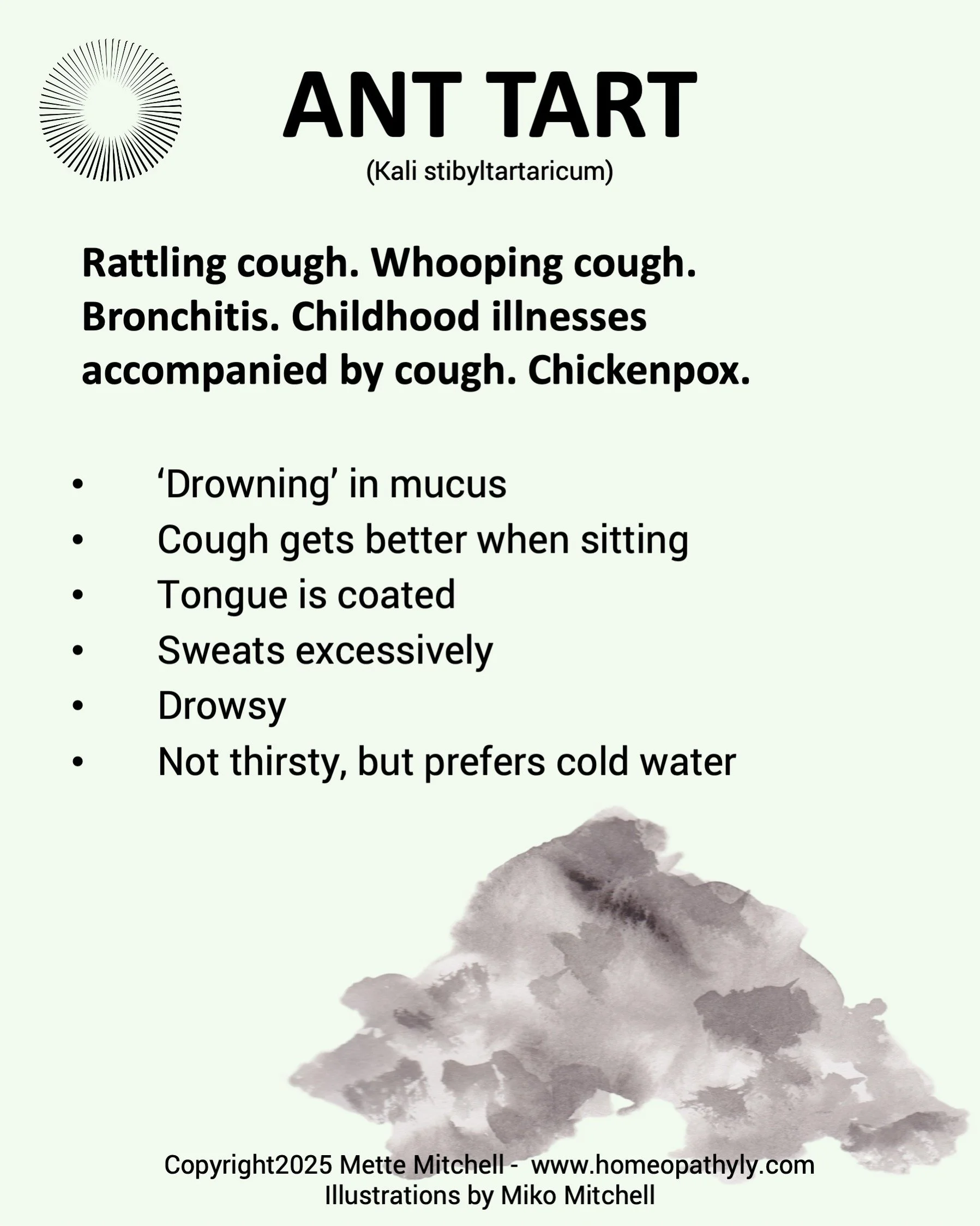 Important remedy for a rattling, loose cough, where you find it difficult to cough up mucus. You sound like you're drowning in mucus. You feel like you are suffocating. Weak, exhausted and debilitated. Feeling annoyed and yawns a lot. It is difficult to breathe, and the patient is forced to sit up in bed to get air. Sometimes it feels as if you are choking when you cough with mucus coming from the lungs. You feel washed out, irritable, and you sweat a lot. All symptoms are worst at night. Heat aggravates the condition.