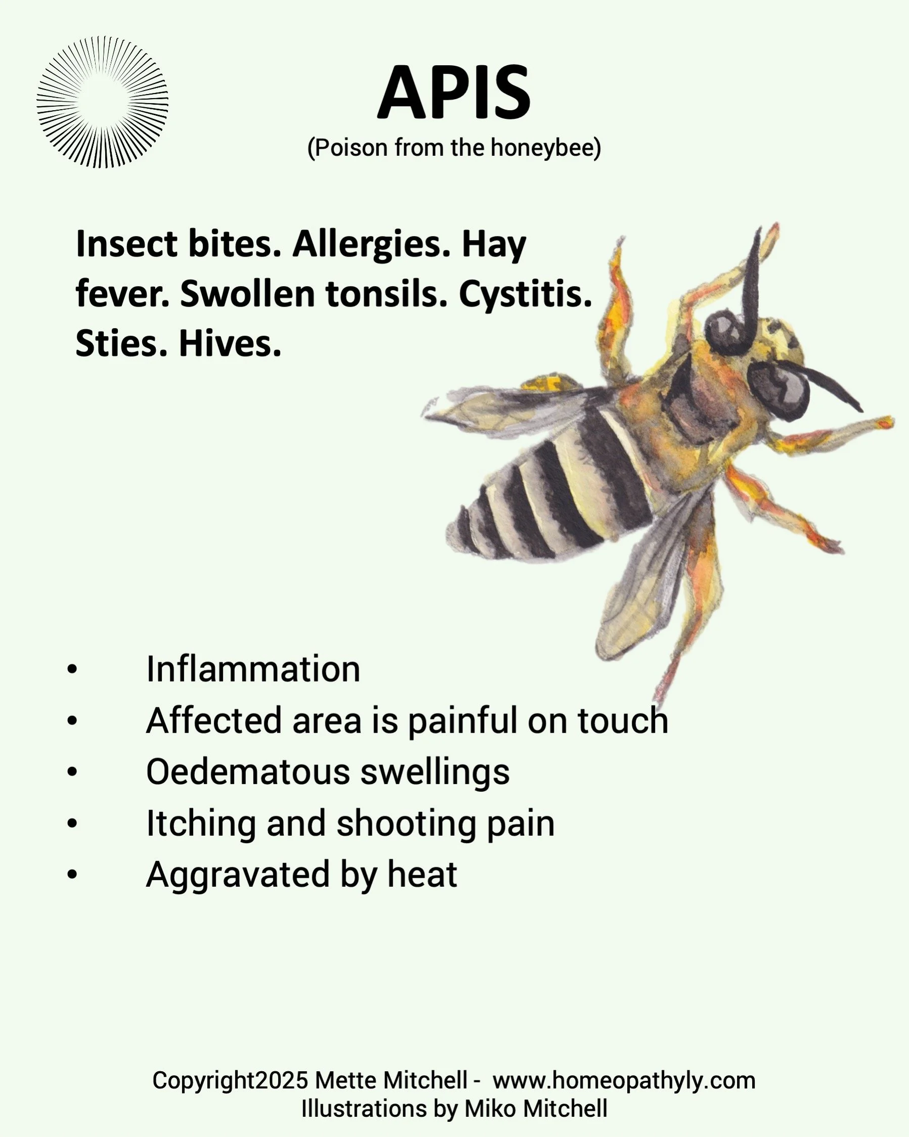 The key symptoms for this remedy are edema, redness, burning pain and stinging. Symptoms are just like a bee sting! Apis is made from the venom of the honeybee.