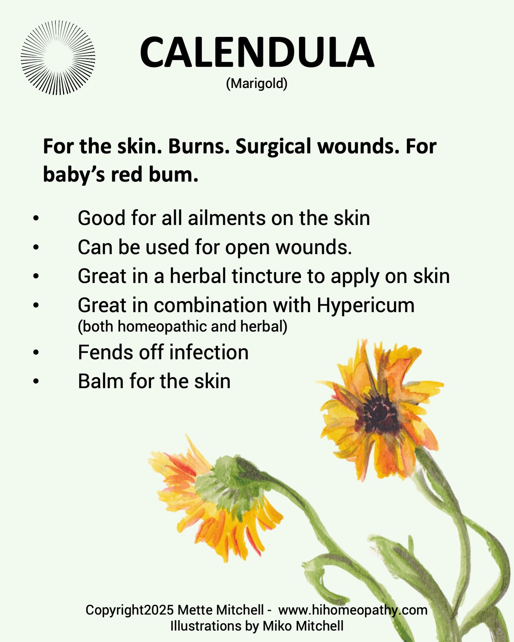 Calendula is also a very useful first aid medicine for wounds, superficial burns, sores on the scalp, and red blemishes, as well as after tooth extractions. It is also a remedy that is used quite routinely after childbirth to heal the skin.