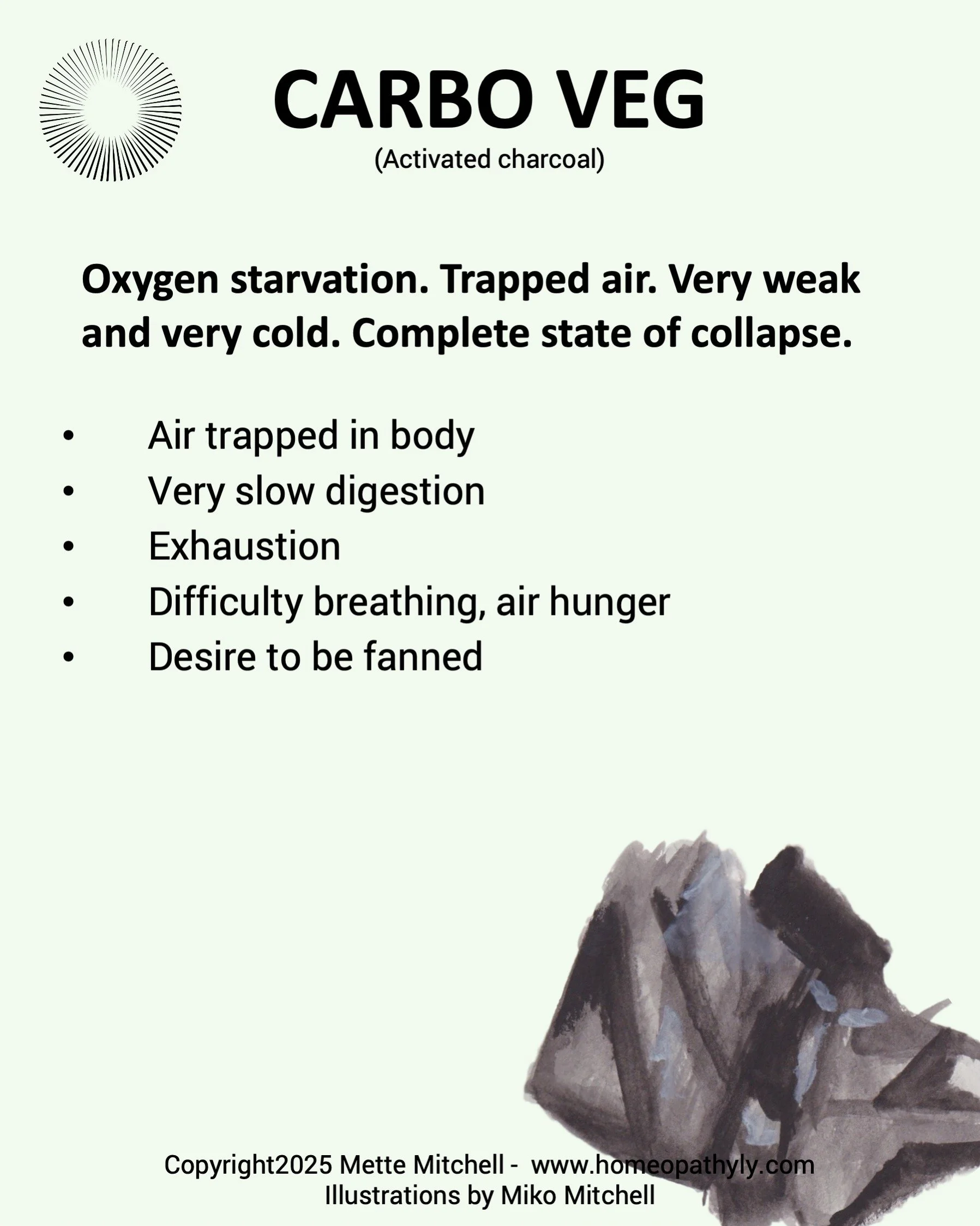 This remedy has reportedly saved many lives. The most extreme carbo veg symptom is a total collapse after lack of oxygen. A remedy that can be used in all cases where you do not feel you can get enough air. Likewise, in the case of an extremely sluggish digestion.