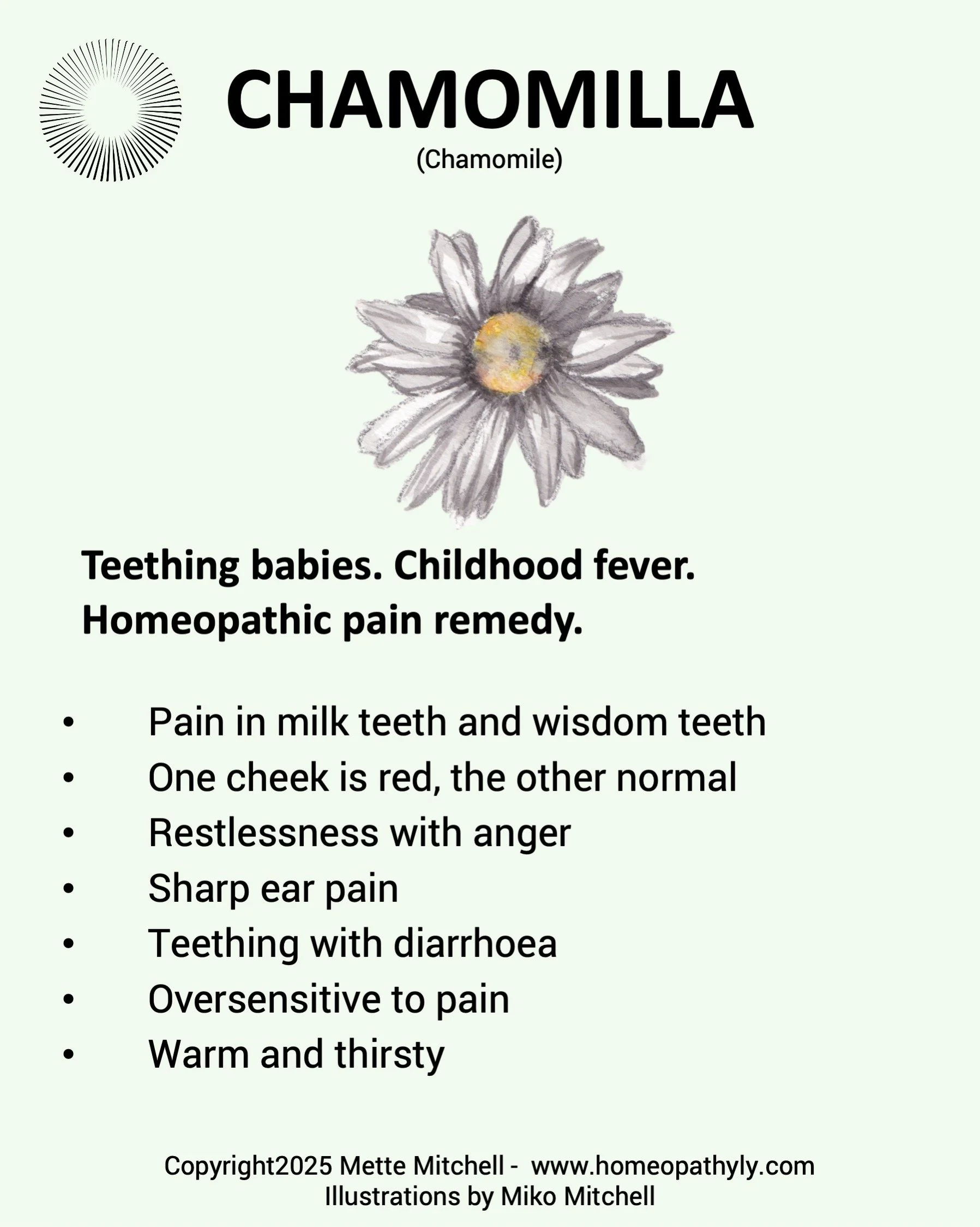 Characteristics of this remedy: extreme hypersensitivity and a great temperament. Demands help one moment and rejects help the next. Rough and argumentative, especially to those closest to you. All pain is experienced as unbearable. They feel overheated and look that way too. It is a widely used pain remedy, and perhaps best known as a remedy we use for dentition.