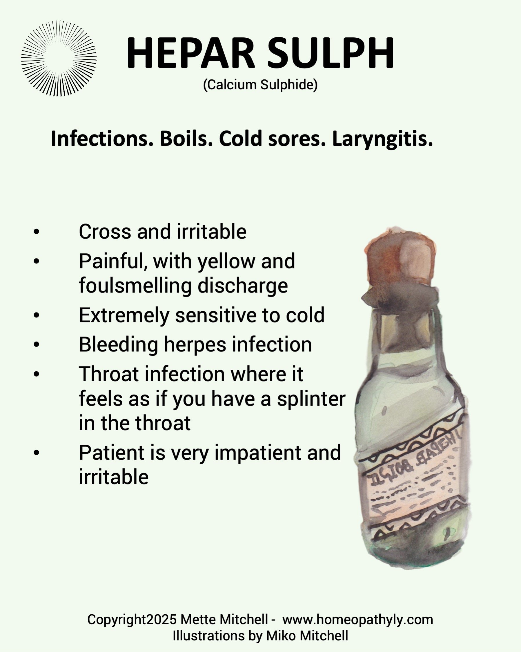 If it is an infection or abscess that is not 'mature' then the time is not quite right for hepar sulph, and you may need to try belladonna first. If belladonna moves the abscess to the next stage so that there is pus forming, then hepar sulph is called for. A hardness will build up in the abscess as the inflammation builds. When the inflammation is on its way out through the skin (or is being absorbed by the lymphatic system), then one can consider using silica, which helps push out the last unwanted matter and helps the wound to heal from below and up, protecting the wound from infection.