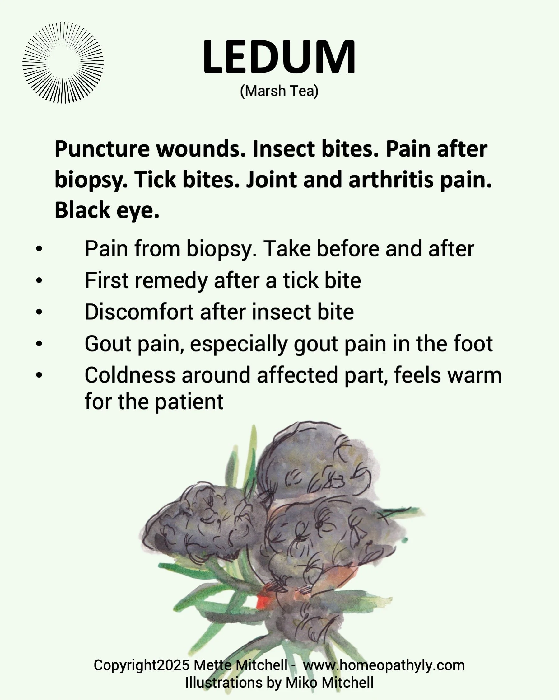 Used for everything where stabbing has taken place. Either because you have been stung by an insect or because you have been stabbed with a needle by the doctor, such as a biopsy. Of course, it is also the first remedy to grab if someone is stabbed by a knife. Very important that it is also the first remedy to prescribe after a tick bite. Ledum in particular is indicated if the area around the bite is cold. The remedy is also used in connection with deep wounds, as when stepping on a piece of glass or a nail. The area around the wound is swollen, blue and cold.
