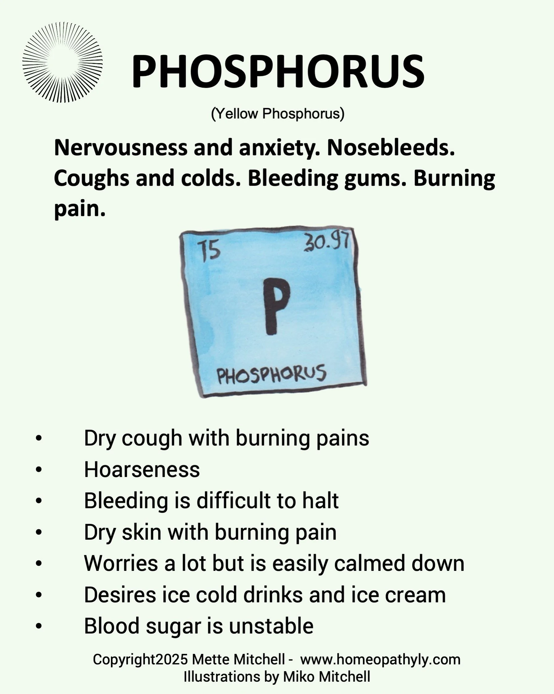 Pain is experienced as burning. Phos cough is typically a dry cough, with a burning pain in the throat. There is also a tendency to bleed a lot and have bleeding that is hard to stop such as small sores, nosebleeds and of course in connection with menstruation. The blood is always completely bright red.