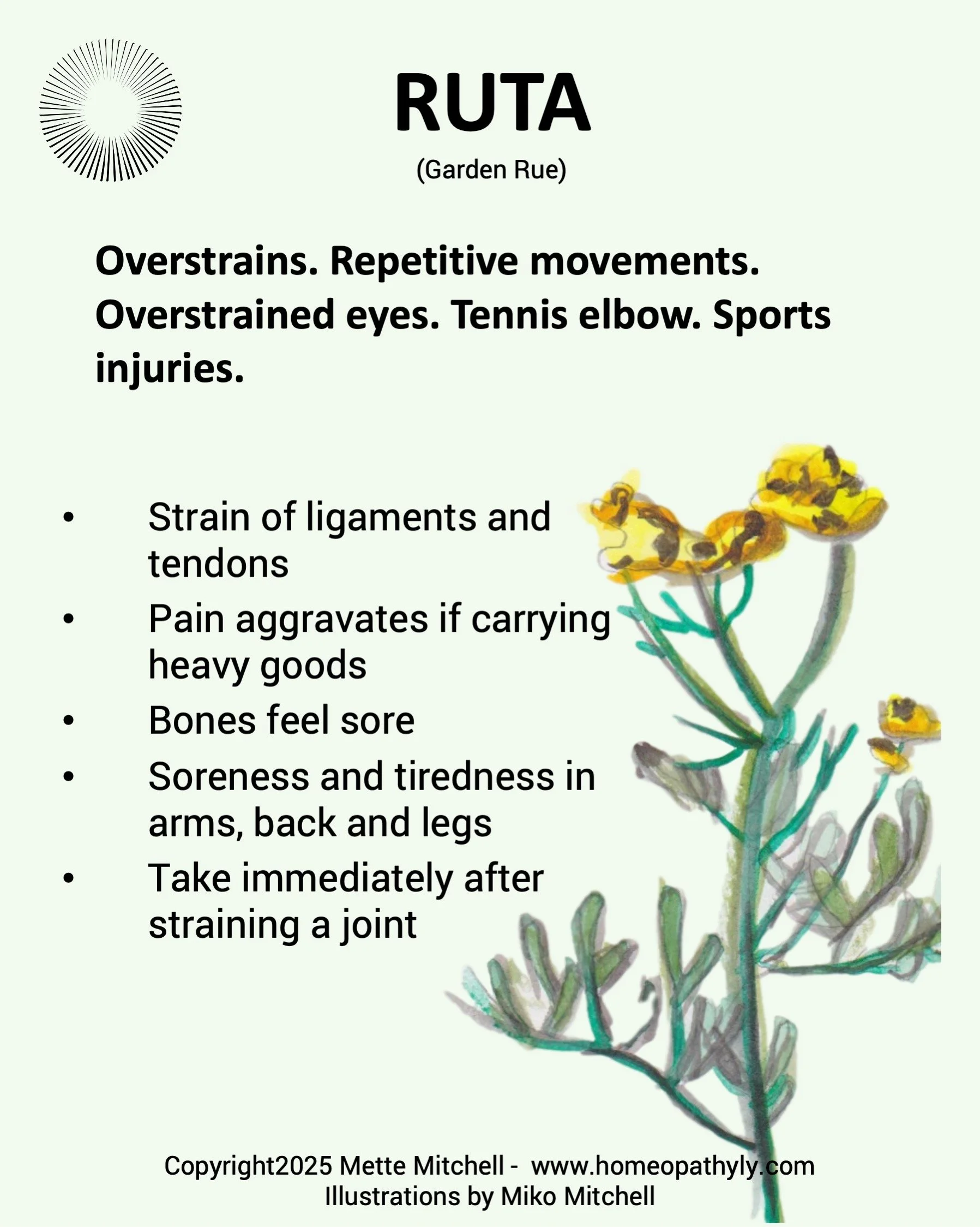 Ruta works deeply but has less clear symptoms than rhus tox. Pain often comes from overexertion, wear, distortions or strains. This remedy is called the 'mason's remedy' because this work is characterized by repetitive movements such as lifting the same weight (e.g. a brick) over and over again, causing strain.