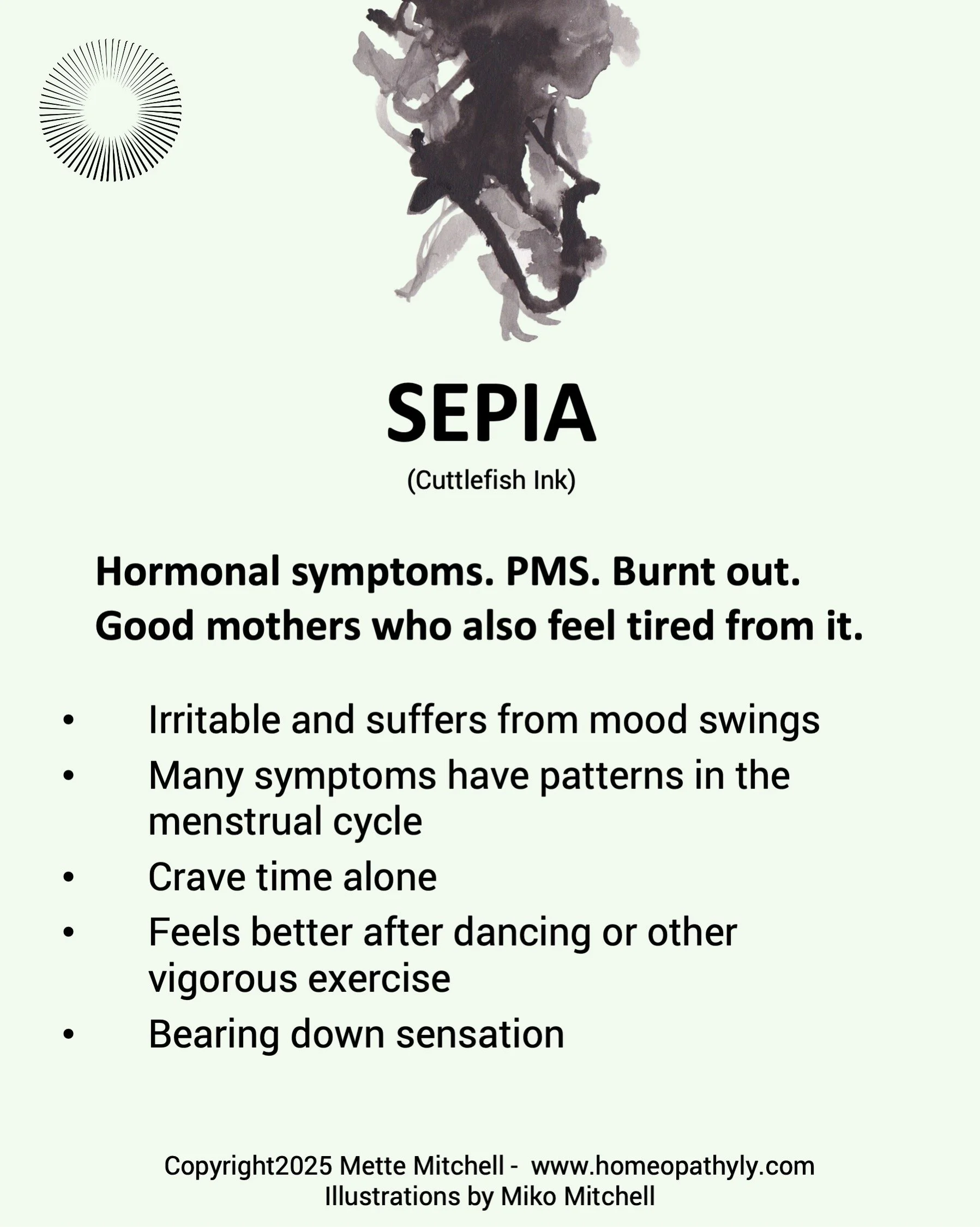It is for the mother who longs to be alone for a little bit. Many women who need sepia are mothers of young children, when it is almost impossible to get a break. They are tired and feel a very physical heaviness in the body. It can almost feel as if one's insides are falling out. In fact, prolapse of the uterus is also a sepia symptom. It may also be used for incontinence. Sepia is well suited for women who feel burnt out from their many obligations and have a feeling of a heaviness that is almost like gravity pulling them down.