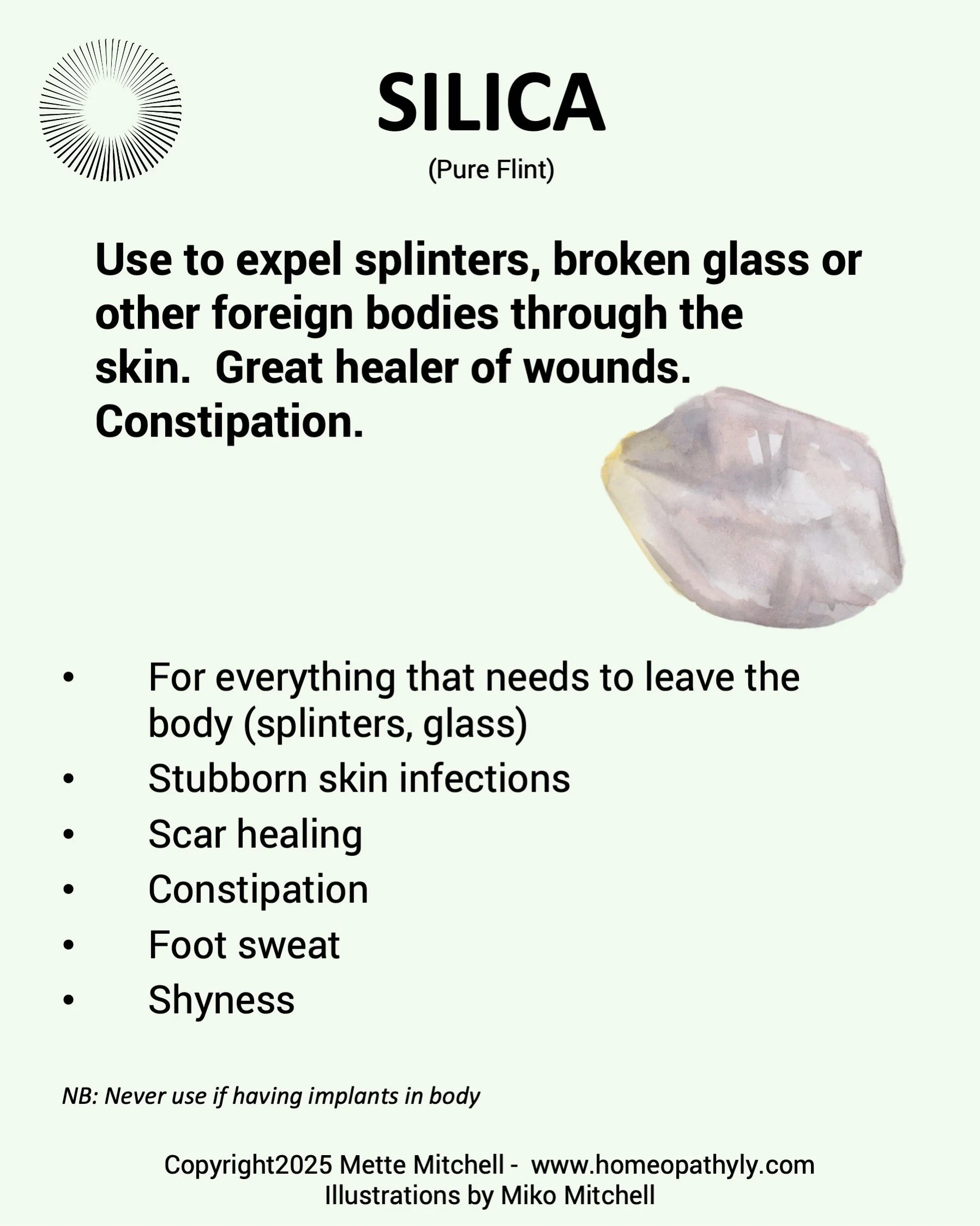 Please note: silica is used to push foreign substances out of the body, such as splinters and broken glass, therefore it is not recommended to take silica if you have something implanted in your body. Do not take this remedy if you have a contraceptive coil, pacemaker, implants, grommets in the ears, metal screws or nails in the body, etc.