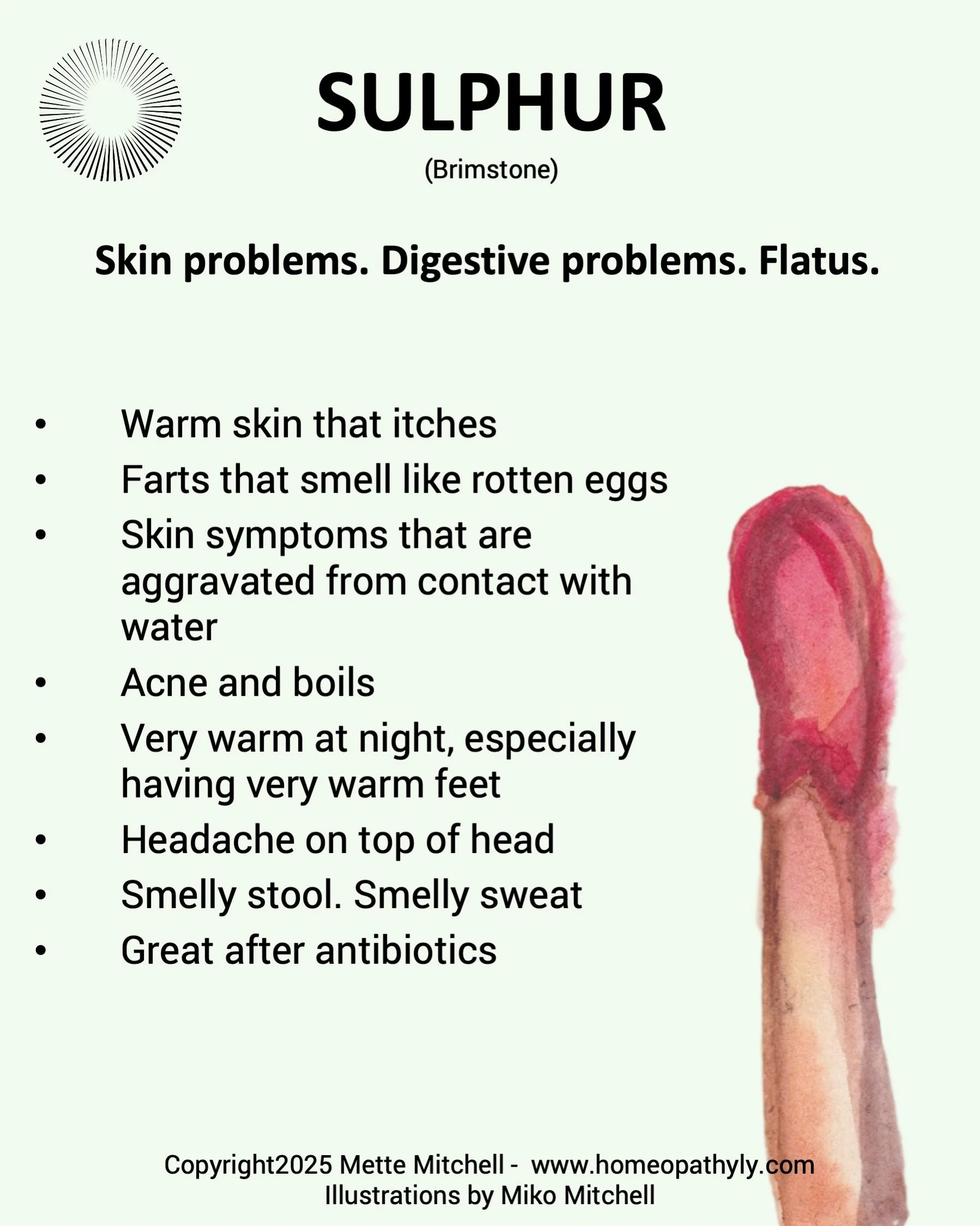 If there is a burning sensation on the skin, along with redness or foul-smelling inflammation, then sulphur is indicated. It doesn’t matter where the symptoms are on the body, it can be the nose, mouth, anus or anywhere. Used for acne and boils.